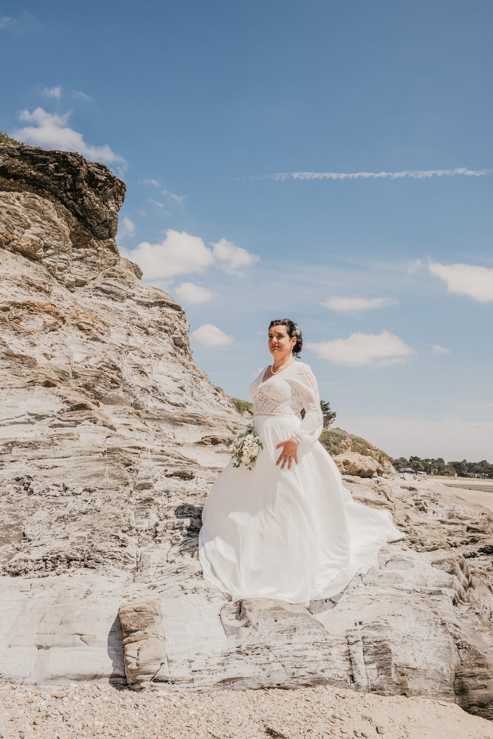 En bord de mer, le vent est un invité surprise. Il peut soulever un voile, faire danser vos cheveux ou rendre une pose imprévisible… Et c’est justement ce qui rendra les photos vivantes ! Privilégiez une coiffure souple, et surtout : ne luttez pas contre les éléments, jouez avec eux.